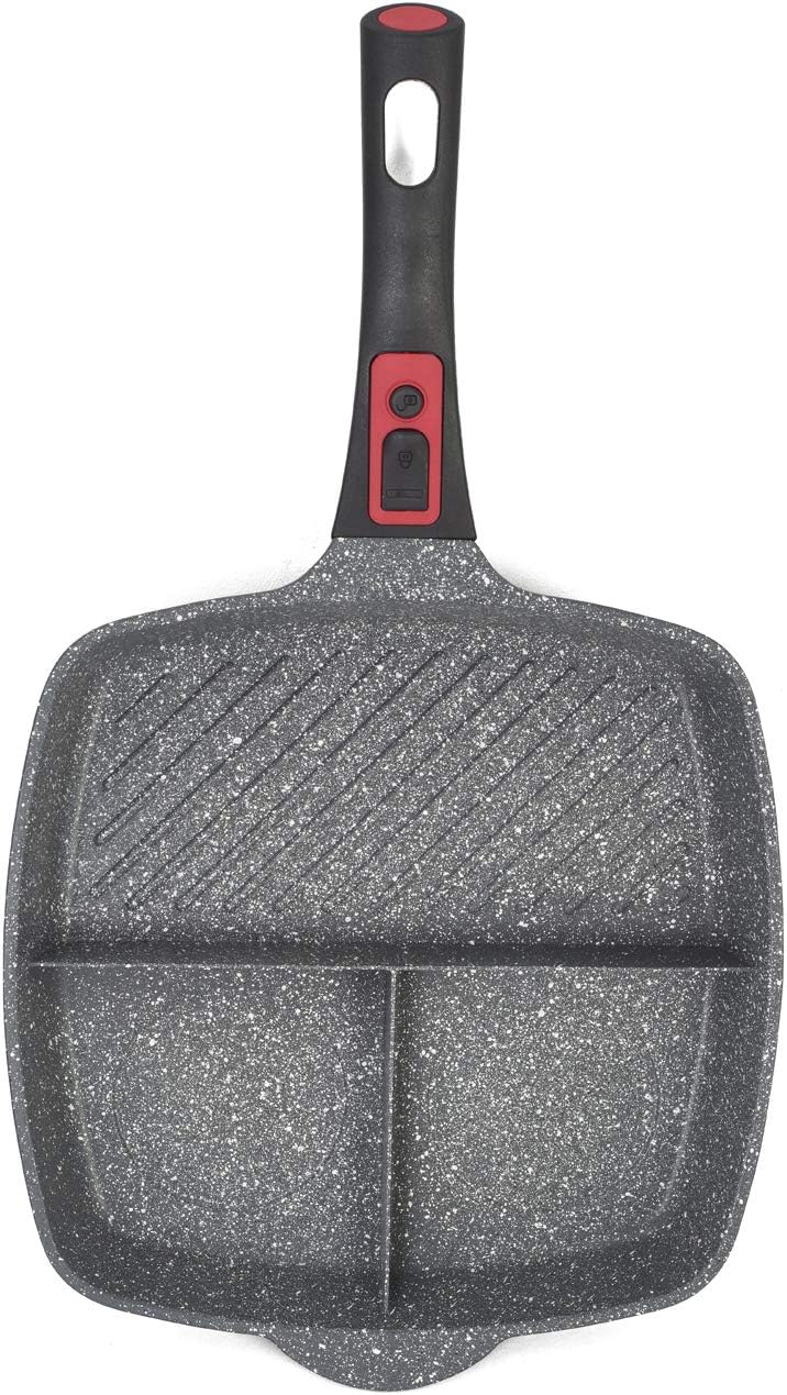 Découvrez cette poêle 3 en 1 de 28 cm avec 4 compartiments, parfaite pour cuire plusieurs aliments simultanément sans mélange de saveurs. Son revêtement antiadhésif de haute qualité et sa structure en aluminium garantissent une cuisson saine et rapide. Compatible avec tous les feux et passe au lave-vaisselle.